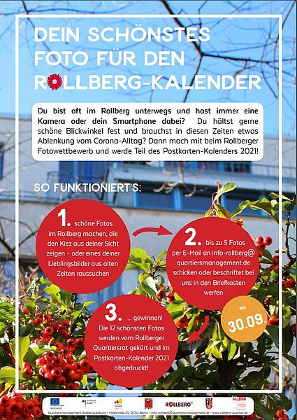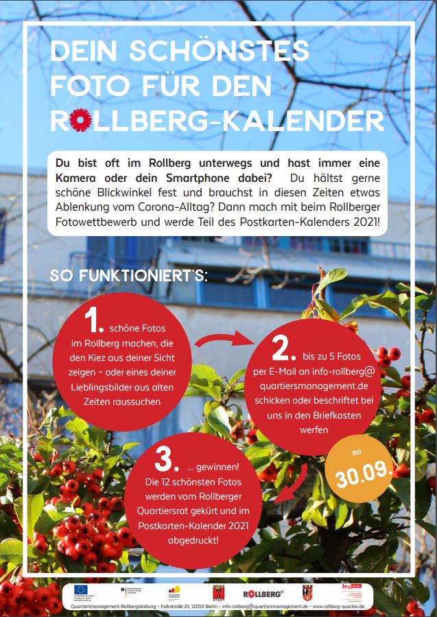 Das QM Marzahn-Nordwest, das Rollberg-Quartier, das QM Moabit West und Moabit Ost suchen die schönsten Impressionen aus der Nachbarschaft. Anschließend werden aus den gelungensten Fotos Kalender für das Jahr 2021 erstellt. Alle Anwohnerinnen und Anwohner des QM Marzahn-Nordwest müssen sich jedoch beeilen, denn der Einsendeschluss ist bereits Ende Mai. In den anderen drei Quartieren läuft die Suche nach den schönsten Motiven noch bis Ende September.