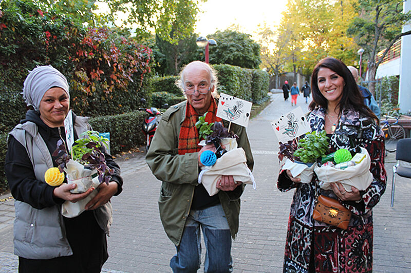 Bei der Koch-Session unter freiem Himmel war das QM mit seiner Preisverleihung des Rezeptwettbewerbs zu Gast. Mehr als 70 Nachbarinnen und Nachbarn wählten aus dem Rezeptbuch „Der Rollberg kocht“ ihre drei Lieblingsgerichte. Auf Platz 1 landete die „Geröstete Kürbissuppe", Platz 2 erreichte der „Jüdische Apfelkuchen" und Platz 3 ging an den „Kisir: Bulgursalat". Alle Gewinnerinnen und Gewinner erhielten vom QM einen Korb mit Leckereien.