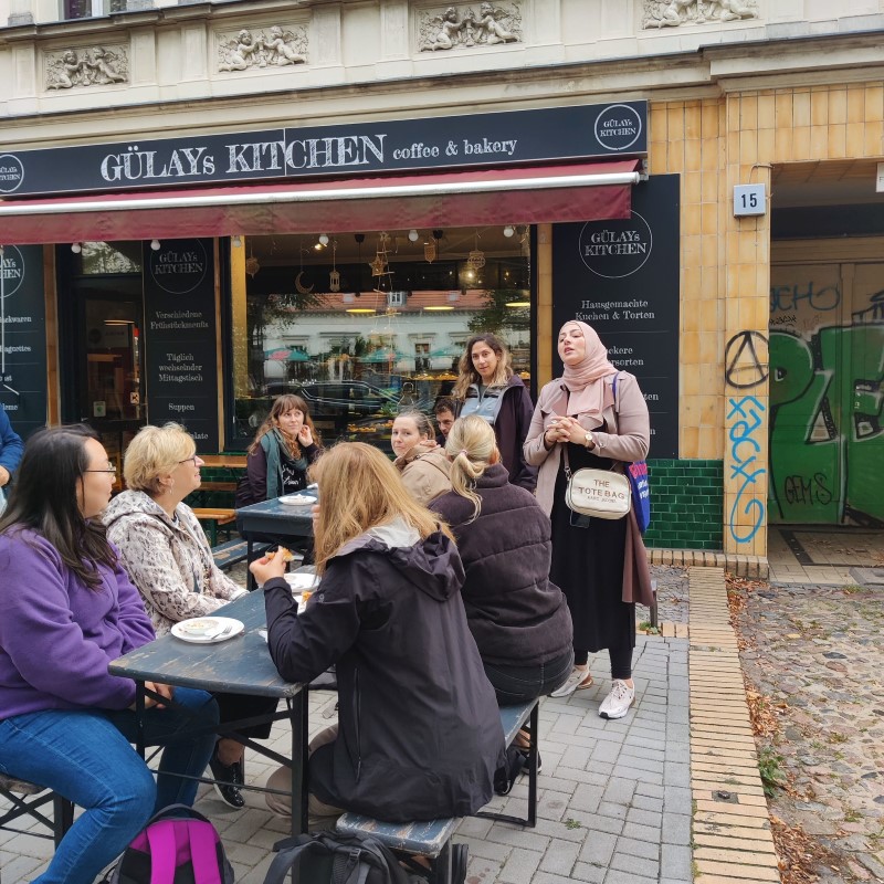 Die Tour führte die Teilnehmenden dann zu Gülays Kitchen am Richardplatz. Hier verwöhnte die Inhaberin die Gäste persönlich mit Tomaten-Eierspeise Menemen und knusprigen Blätterteigstangen. Die mutige Entscheidung der Inhaberin, sich trotz sprachlicher Barrieren selbstständig zu machen, beeindruckte alle. Ihr Mann war deshalb anfangs skeptisch. Dennoch erlernte sie die Sprache und übernahm die Buchhaltung eigenhändig, während ihr Mann unterstützend zur Seite stand.