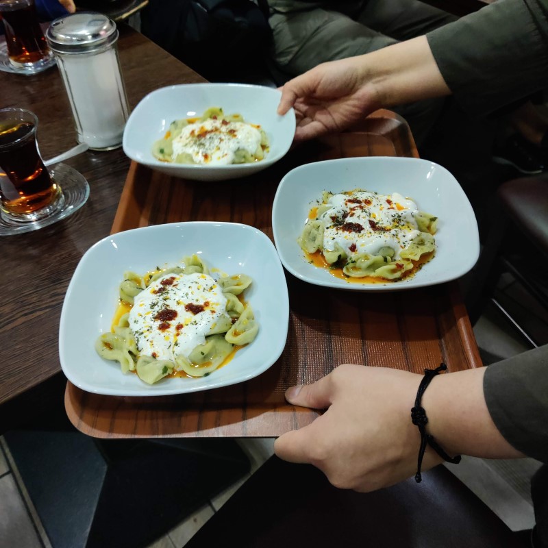 Im Café Evim genossen die Teilnehmenden der Tour vegetarische Manti – kleine Teigtaschen mit einer Gemüsefüllung. (Bild: Birgit Leiß)