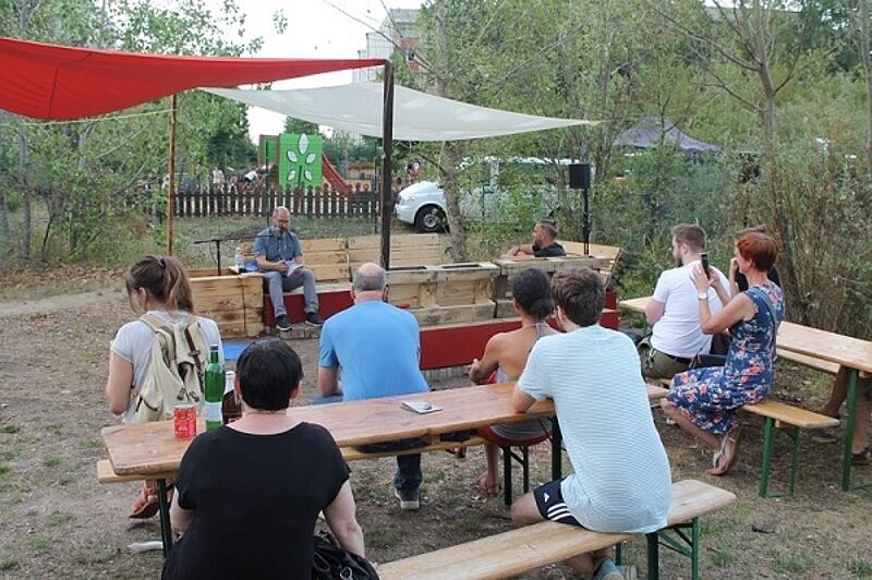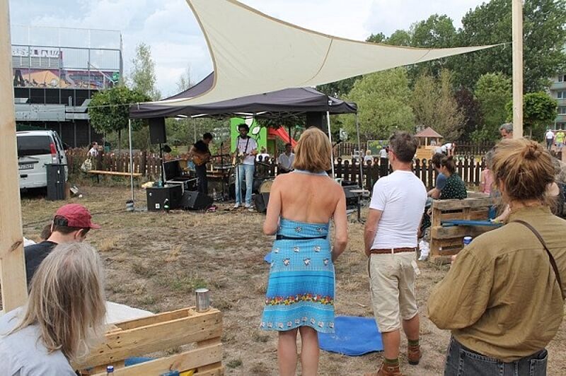 Das Festival möchte den lokalen Kulturschaffenden eine Bühne geben und zusätzlich den Diskurs über verbesserte Unterstützungsmöglichkeiten anstoßen. Neben einem vielseitigen Musik- und Kunstprogramm stand deswegen auch eine Talkrunde auf der Tagesordnung. Jochen Becker und Adam Page von der Projektgruppe „station urbaner Kulturen“ diskutierten mit Interessierten darüber, wie verbesserte Rahmenbedingungen für Kultur und Kunst in einer Großwohnsiedlung wie Hellersdorf geschaffen werden können.