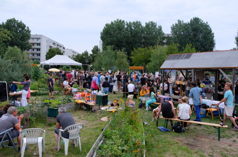 Der Gemeinschaftsgarten Helle Oase war Gastgeber des Festivals. Alle Garten-Freundinnen und -Freunde können in der Oase Beete bepflanzen und pflegen. Während des HellD-Festivals eröffnete das Gartenteam eine Repairstation für Geräte. Kinder konnten Kräutersalz mit selbstangebauten Kräutern herstellen und nach Lust und Laune reifes Obst und Gemüse ernten.