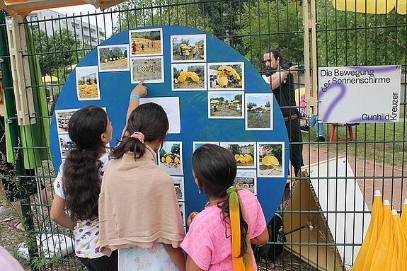 Im Rahmen des Projektes „Bewegte Sonnenschirme“ wurden gelbe, auffällige Sonnenschirme im Kiez verteilt. Sie bildeten Wörter, die nur aus der Luft zu erkennen waren und entpuppten sich als echte Hingucker. Auf dem HellD-Festival wurden die Luftaufnahmen und Fotos des Kunstprojektes ausgestellt.
