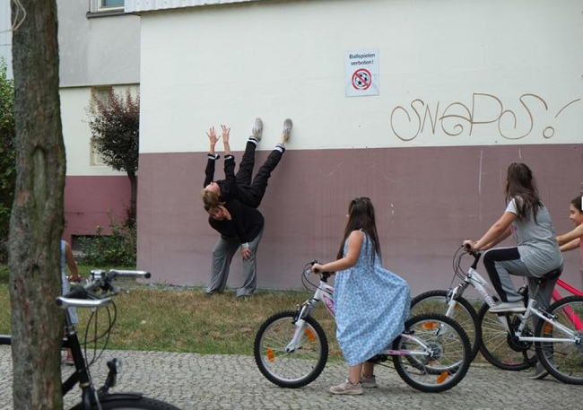 Die Tanzakrobaten Franziska Pack und Cox Ahlers weckten die Neugier der kleinen und großen Anwohnenden. Bild: QM Weiße Siedlung Dammweg W+P GmbH u. H. Heiland