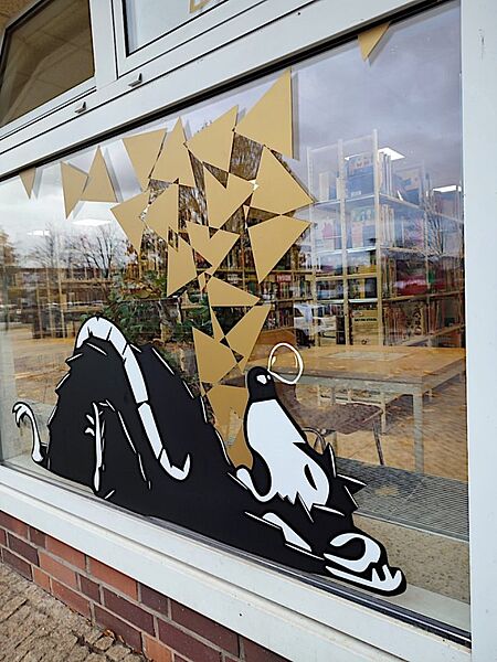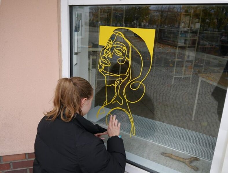 Sechs junge Leute der Gruppen Instinktiv Kreativ e. V. und Tape Art Collaboration verzierten die Fenster der Ehm-Welk-Bibliothek mit Folienstreifen. Das Ganze nennt sich „Tape Art“ und ist eine spezielle Form der Straßenkunst. Der „Instinktiv Kreativ e. V.“ wurde in diesem Jahr offiziell gegründet und beantragte Geld aus dem Aktionsfonds des QM.