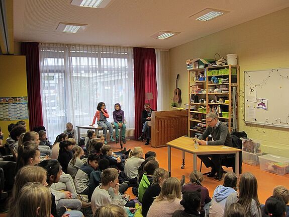 Im Anschluss an die Lesung stellten die Schülerinnen und Schüler dem Staatssekretär Fragen zu Politik und seiner Arbeit. Thematisch ging es um Neuwahlen, Gründe für seine Mitgliedschaft in einer Partei oder wie er zu Satire über die eigene Partei stehe – die Kinder wollten es dabei ganz genau wissen.