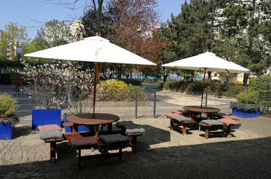 Fest im Boden verankerte Bänke und Tische laden zum Verweilen ein. Der Lesegarten der Stadteilbibliothek an der Obstallee hat eine neue Ausstattung bekommen. Bänke und Tische sind eine kostenfreie Dauerleihgabe des Gemeinwesenvereins Heerstraße Nord, während die Kissen, Schirme und demnächst auch noch weitere Pflanzenkübel durch das laufende QM-Projekt "Staaken liest!" finanziert werden. So lässt es sich auch bei Sonnenschein und sommerlichen Temperaturen gut schmökern.