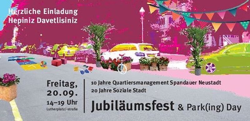 Park statt Parkplatz – das wird auf dem Jubiläumsfest der Spandauer Neustadt Realität. Mithilfe der Initiative PARK(ing) Day Berlin bleiben die Parkplätze autofrei und die Lutherstraße bietet an diesem Tag viel Raum für Nachbarschaft, Gespräche, Kaffee, Spiel und Spaß.