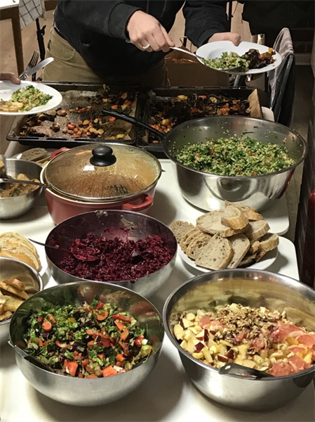 Den thematischen Einstieg in den geselligen Abend machte ein Quiz, in dem die Teilnehmenden ihr Wissen zu Wurzelgemüse und Küchenkräutern testen und so manchen Aha-Moment erleben konnten. Ein kleines Samenpaket für die heimische Kräuteranzucht gab es als Geschenk obendrauf. Nach der kniffeligen Wissensrunde ging es ans Schnippeln. Aus Wirsing, Roter Beete, Kartoffeln und vielen anderen geretteten Lebensmitteln zauberten die kochinteressierten Kinder und Erwachsenen ein reichhaltiges Buffet. Buntes Ofengemüse, ein Dip aus Roter Beete und drei große Schüsseln mit Obst- und Gemüsesalat wurden zu den Stars des Abends. Ein Anblick, der auch viele vorbeikommende Besuchende magisch anzog. Am Ende kam eine Gruppe aus circa 30 Leuten am Tisch zusammen, die den Abend genüsslich ausklingen ließen. Alle Teller und Töpfe wurden restlos leer. Das Einzige, was übrigblieb: Der Wunsch, solch einen geselligen Abend bald zu wiederholen.