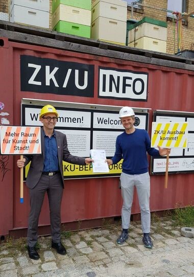 Mitte September 2020 war es soweit: Bezirksbürgermeister Stephan von Dassel übergab Bauherrn Matthias Einhoff (KUNSTrePublik e.V.) persönlich die Baugenehmigungsunterlagen. Der Weg bis zur Baugenehmigung war steinig. Die Quartiersratsmitglieder suchten nach langen Abstimmungsprozessen Unterstützung bei der Bezirksverordnetenversammlung (BVV) Mitte. Diese konnte nach mehrfachen Anträgen die Baugenehmigung schließlich erzielen. Umso mehr freuen sich das QM- und ZK/U-Team über den endgültigen Baubeschluss.