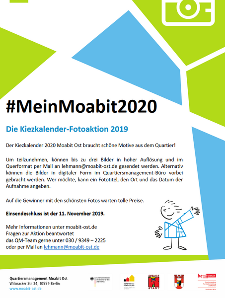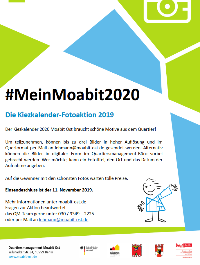 Du möchtest, dass dein Bild im Kalender abgedruckt wird? Dann schicke maximal drei Bilder in hoher Auflösung per Mail an lehmann@moabit-ost.de. Alternativ können die Bilder in digitaler Form im Quartiersmanagement-Büro vorbei gebracht werden. Wer möchte, kann ein Fototitel, den Ort und das Datum der Aufnahme angeben. Der Einsendeschluss ist der 11. November 2019.