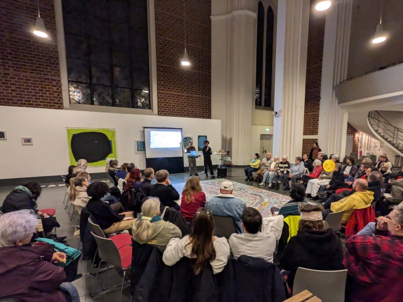 Viele Menschen diskutieren bei der Auftaktveranstaltung von „Mach mit Moabit“ in der Heilandskirche über soziales Engagement im Stadtteil.