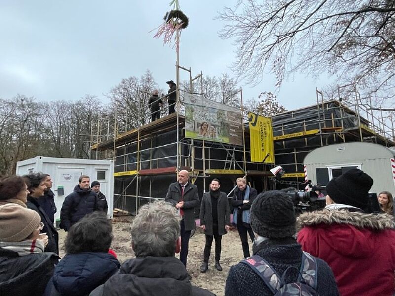 Zu den Gästen des Richtfests gehörten unter anderem Stephan Machulik, Staatssekretär für Wohnen und Mieterschutz, Ephraim Gothe, Bezirksstadtrat für Stadtentwicklung und Facility Management, sowie Christoph Keller, Bezirksstadtrat für Jugend, Familie und Gesundheit. Sie drückten ihre Freude über den Neubau für die Kinder und Jugendlichen aus, dankten allen Beteiligten und wünschten gutes Gelingen für die weiteren Bauarbeiten. Die Zimmerleute hielten den traditionellen Richtspruch. Dabei standen sie mit vollem Glas oben auf dem Gerüst und warfen es für Glück runter. Danach beendeten sie die Rohbauarbeiten, indem sie die letzten Nägel versenkten.