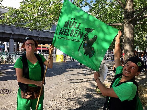 Seit Anfang Juli 2020 sind Lorena Terzi und Ricardo Valdivia etwa zwei Mal pro Woche für zweieinhalb Stunden an verschiedenen Stationen rund um das Kottbusser Tor unterwegs. Sie tragen grün-schwarze Kleidung und in der Hand eine große Fahne mit der Aufschrift „Müllhelden statt Müllhalden“. Sie sprechen mit Anwohnerinnen und Anwohnern über das, was in vielen Ecken oder auf dem Straßenpflaster liegt: weggeworfene Plastiktüten, Zigarettenstummel und anderer Müll wie Verpackungen oder Sperrmüll.