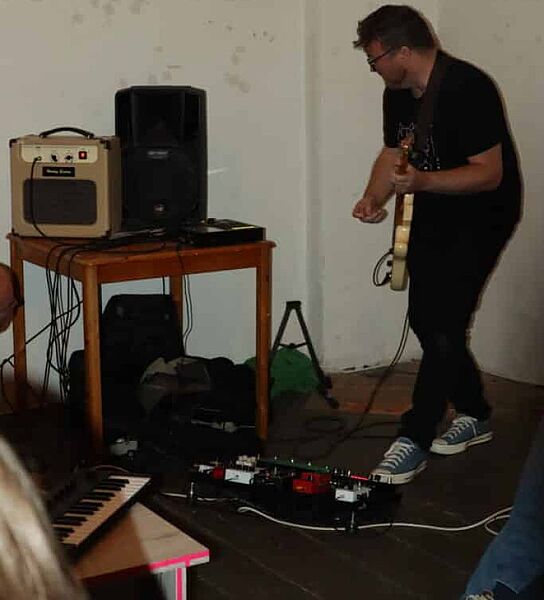 Ein Mann steht mit einer elektronischen Gitarre an einem Verstärker und Lautsprecher; Effektgeräte und ein kleines Keyboard liegen auf dem Boden.