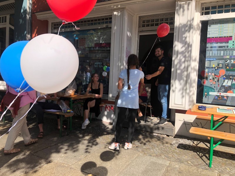 Vor dem Büro verteilte das QM-Team Helium-Luftballons. Erfolgreiche Kiez-Quiz-Teilnehmende wurden von lokalen Gewerbetreibenden mit kleinen Preisen belohnt. Ein Gebietswimmelbild im Fenster des QM-Büros rundete den Tag ab.