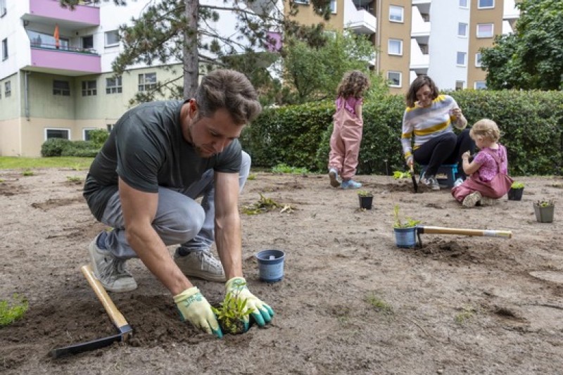 In nur wenigen Stunden verwandelten 15 engagierte Kinder und Erwachsene einen Teil der Fläche vor der Celsiusstraße 9 in einen insektenfreundlichen Lebensraum. Sie legten eine etwa 150 Quadratmeter große Blumenwiese an und pflanzten zusätzlich 120 heimische Initialstauden. Teilgenommen haben insbesondere naturinteressierte Anwohnende sowie Vertreterinnen und Vertreter des QMs, des Wohnungsunternehmens Vonovia und der Stiftung für Mensch und Umwelt.