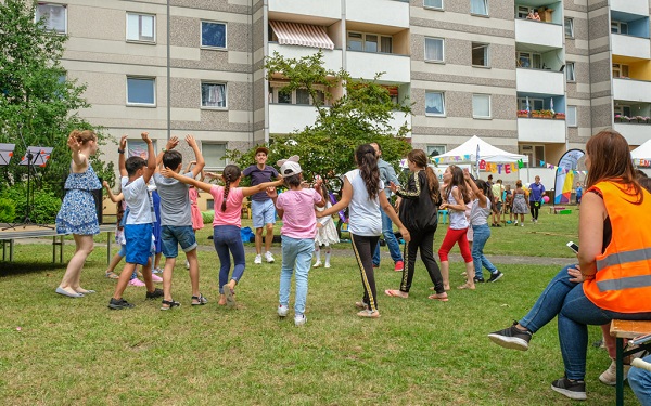 Das Fest wurde vom Quartiersmanagement im Falkenhagener Feld West, BENN und der Gewobag gemeinsam mit Nachbarinnen und Nachbarn organisiert. Diese stellten ein vielseitiges Programm auf die Beine: Die Kinder malten und bastelten, tobten auf einer Hüpfburg und staunten angesichts der Kunststücke eines Zauberers. Zudem trug eine Gruppe von Kinder zur musikalischen Unterhaltung bei, indem sie ein paar Stücke auf ihren Instrumenten zum Besten gaben.