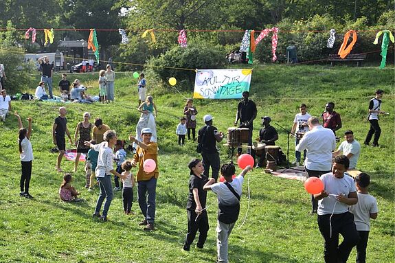 Nach dem Nachbarschaftsfest ist vor dem Sommerfest. Dieses beging das QM Germaniagarten gleich einen Tag später – am Sonntag, den 4. September 2022. Im Oberlandpark herrschte ein kunterbuntes Treiben, denn gleichzeitig fand auch der Kultursonntag von Lunaelaltro statt. Oliver Schworck, Bezirksstadtrat für Jugend und Gesundheit, eröffnete mit Quartiersmanagerin Seira Kerber das Sommerfest und dankte den organisierenden Anwohnenden.