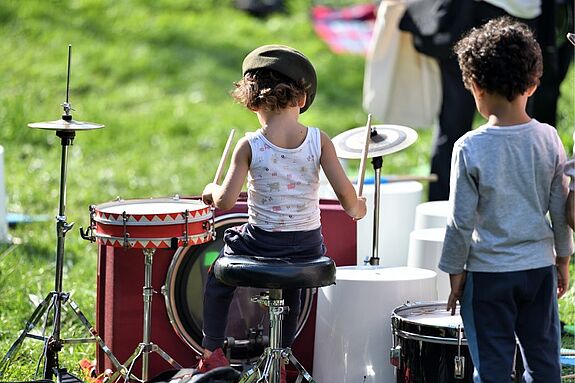 Für das leibliche Wohl sorgte allerlei Grillgut, leckere Waffeln der Villa Holz und afrikanische Köstlichkeiten des Lernlabors. Frisch gestärkt und bunt geschminkt ging es schließlich zum Dosen Werfen und Musizieren. Auf dem Rasen zog Nico Lippolis, der Schlagzeugmagier, die Kinder in seinen Bann. Mit Hingabe und zum Teil erstaunlichem Rhythmusgefühl trommelten sie um die Wette. Als dann „Heart Beats of Africa“ aufspielten, hielt es keinen mehr auf den Bänken.