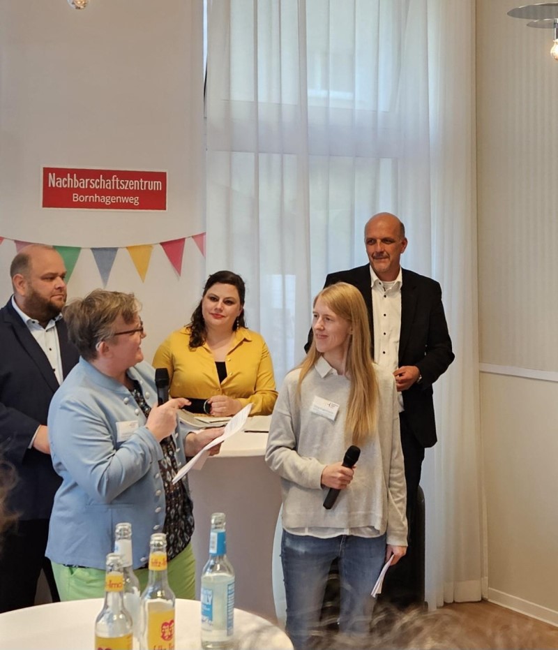 Das Zentrum war bis auf den letzten Platz besetzt, einige Besuchenden mussten sogar draußen warten. Es war deutlich spürbar, dass das Nachbarschaftszentrum Bornhagenweg des Trägers Pestalozzi-Fröbel-Haus ein wichtiger Treffpunkt für die Anwohnenden werden wird. Hier können Menschen zusammenkommen, sich austauschen und gemeinsam aktiv werden.