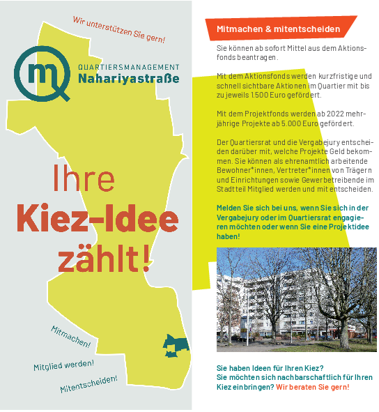 Im Januar 2021 begann die Arbeit des neuen Quartiersmanagement (QM)-Teams in der Nahariyastraße. Jetzt sind Ihre Ideen für die Kieznachbarschaft gefragt. Gesucht werden Projekte, die den Kiez schöner und den Nachbarschaftszusammenhalt stärker machen. Projekte können mit bis zu 1.500 Euro unterstützt werden. Wie das Ganze funktioniert, wird in einem neuen Faltblatt erklärt.