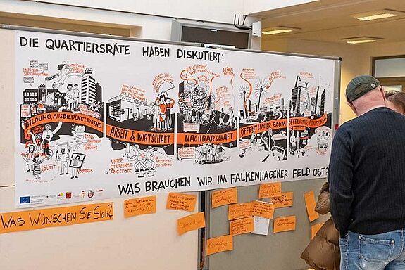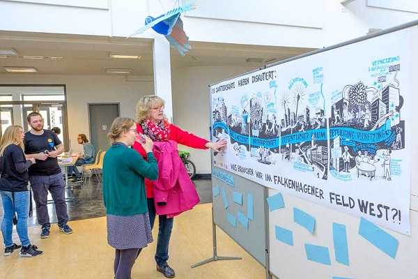 In 25 von 34 Quartieren läuft derzeit die Aktualisierung der Integrierten Handlungs-und Entwicklungskonzepte (IHEK) für die nächsten drei Jahre. Die Quartiersmanagements im Falkenhagener Feld-Ost und West gingen einen neuen Weg, indem die Ergebnisse der Bürgerforen visualisiert wurden.