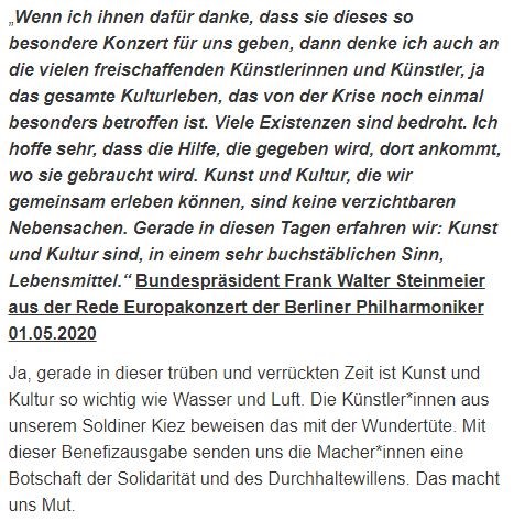Kunst und Kultur sind so wichtig wie Wasser und Luft, schreibt das QM-Team Soldiner Straße in Anlehnung an eine aufbauende Rede des Bundespräsidenten Frank Walter Steinmeier. Deshalb war es wichtig, dieses ungewöhnliche Projekt unter den ungewöhnlichen Umständen an den Start zu bringen. In Zeiten von Corona ging die Jury neue digitale Wege. In einem "Express -Umlaufverfahren" wurde die Wundertüte möglich, um Betroffenen schnellstmöglich zu helfen.