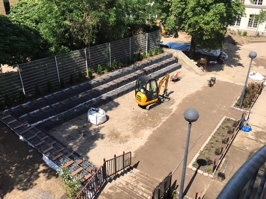 So entstand ein Schulhof mit viel Grün und Sitzgelegenheiten, der den Anforderungen der Schülerinnen und Schülern entspricht. Bei den Baumaßnahmen packten die Studierenden mit einigen Jugendlichen selbst an.
