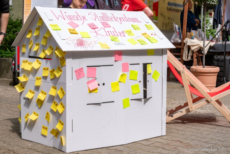 Ein symbolisch für das Stadtteilzentrum stehendes Haus aus Pappe ist mit zahlreichen Ideen und Wünschen der Kinder dekoriert. (Bild: www.salecker.info)