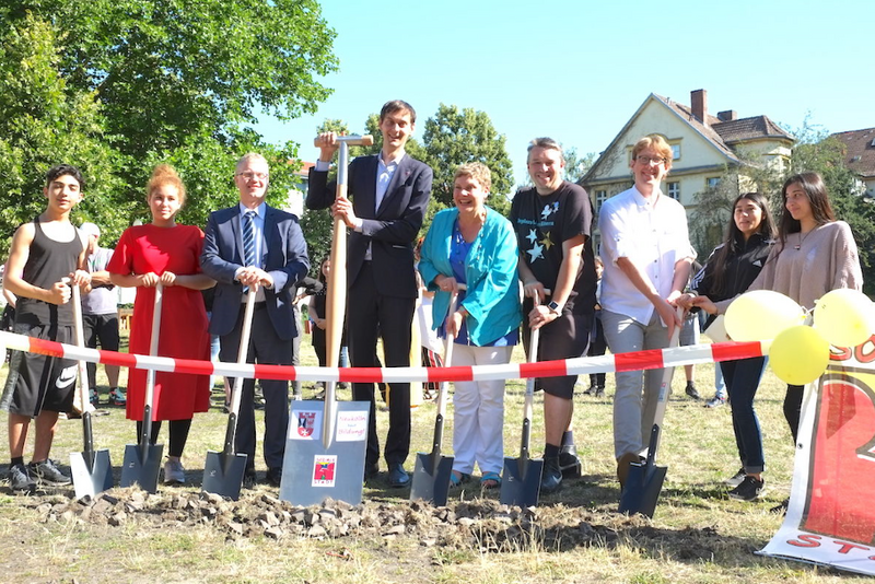 Den symbolischen Bauauftakt für die Umgestaltung übernahm der Neuköllner Bezirksbürgermeister Martin Hikel gemeinsam mit der Bezirksstadträtin für Bildung, Schule, Kultur und Sport Karin Korte und dem Bezirksstadtrat für Stadtentwicklung, Soziales und Bürgerdienste Jochen Biedermann. Mit dabei waren auch die Schulleitung, Lehrkräfte, Schülerschaft sowie Elternvertreterinnen und -vertreter der Integrierten Sekundarschule sowie das Bezirksamt Neukölln, die Kiez AG Köllnische Heide, das Team des Quartiersmanagements und Aktive aus dem Quartiersrat.