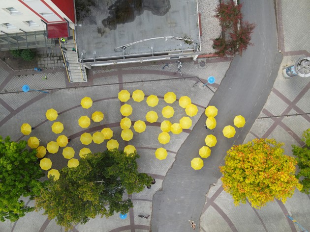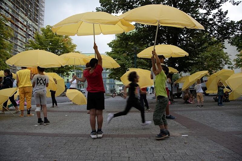 Vom 21. November bis zum 5. Dezember 2021 zeigt die Kunstaktion „Picknick mit Schirm“ ihre Ergebnisse an verschiedenen Orten im Quartier. Bei dem Projekt erhielten die Bewohnerinnen und Bewohner des Kiezes einen gelben Schirm, mit dem sie sich dann zu verschiedenen Skulpturen formierten.