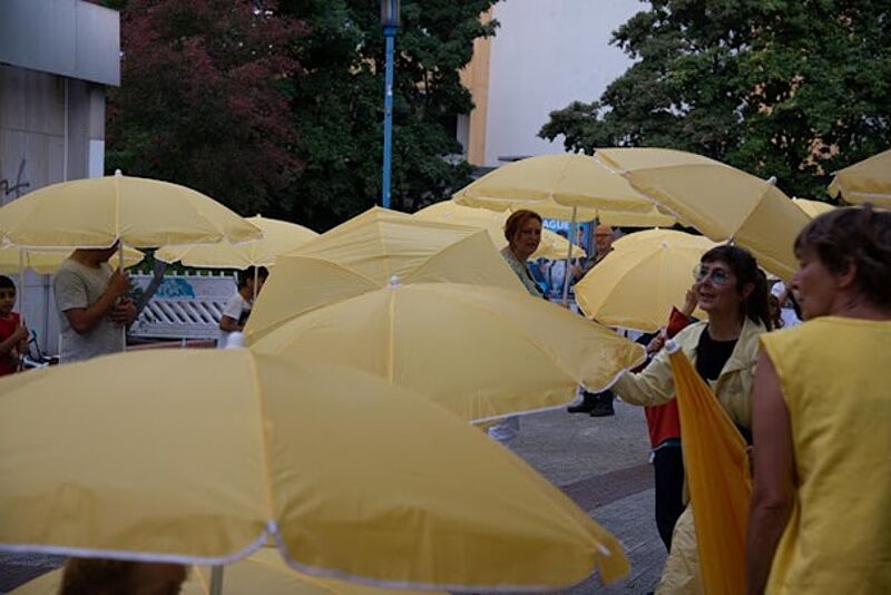 Die Bewohnerinnen und Bewohner des Kiezes haben sich zusammen mit gelben Schirmen in große Skulpturen verwandelt. (Foto: Rosa Vill)
