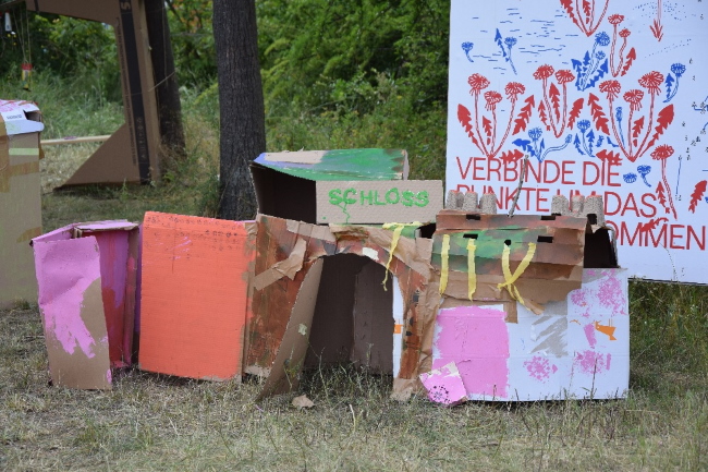 Nach der Präsentation der Bauwerke aus dem Kinder-Workshop ging es weiter mit den Ergebnissen der erwachsenen Künstlerinnen und Künstler. Im vierten Teil der Reihe KREISE ZIEHEN stand das Leben von Jugendlichen und Kindern in einer Großsiedlung im Mittelpunkt. Die Arbeitsgruppe „Spielclub“ zeigte auf einer großen Plakatwand Bilder einer Spielstadt, die 1971 im öffentlichen Raum im Märkischen Viertel Berlin von Künstlerinnen und Künstlern mit und für Kinder gebaut wurde. Auf einer zweiten Plakatwand präsentieren die Künstlerin Marija Nemcenko und Kuratorin Anna Tüdös Teile ihrer Recherche zum Thema „BRUT Boredom. High-rises, emptiness and play“ (Übersetzung: „Brutale Langeweile. Hochhäuser, Leere und Spiel“). Außerdem wollen sie noch diesen Sommer eine Arbeit zum Thema „Spielen und Bewegung“ entwickeln und bauen.