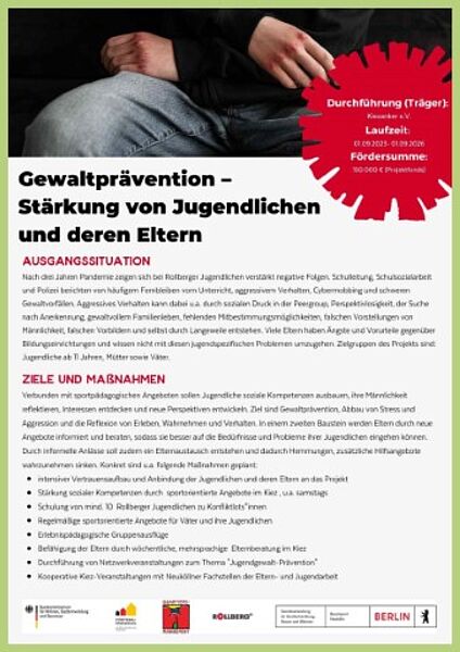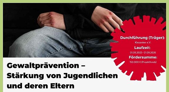 Das Projekt „Gewaltprävention – Stärkung von Jugendlichen und deren Eltern“ wird von dem Träger Kiezanker e.V. umgesetzt. Der Verein hat einen Arbeitsschwerpunkt der Elternbildungsarbeit und ist gut im Kiez vernetzt.