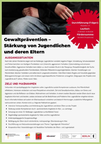 Im Quartiersmanagement-(QM)-Gebiet Rollbergsiedlung startete am 1. September 2023 das Projekt „Gewaltprävention – Stärkung von Jugendlichen und deren Eltern“. Das Ziel ist es, mit verschiedenen Angeboten gewaltsames Verhalten vorzubeugen.