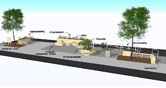 Gegenüber der Rixdorfer Schule in der Donaustraße sollte im Frühling 2020 eine grüne Ecke mit Pflanzbeeten und hölzernen Sitzgelegenheiten entstehen. Aufgrund der Corona-Pandemie wurde der Aufbau pausiert und wird hoffentlich im Sommer 2021 fortgeführt. (Grafik: Life e.V.)