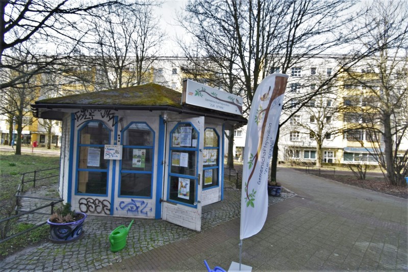 Der Holzpavillon „Zur Spinne“ wird kontinuierlich aufgewertet, damit er im besseren Zustand von Anwohnenden und Einrichtungen genutzt werden kann. Die aktuelle Aufwertung und Neugestaltung wird aus Mitteln des Aktionsfonds gefördert.