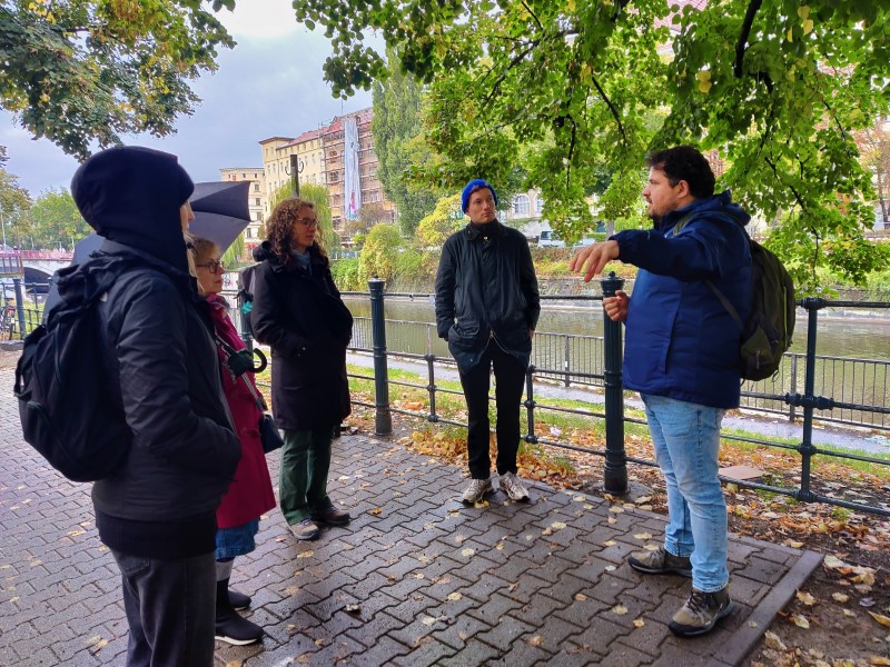 Treffpunkt an diesem verregneten Nachmittag war das Maybachufer. Dort berichtete der Tourguide Abuhanna Muosa vom Verein querstadtein e. V. über die politischen Verhältnisse in seinem Heimatland Syrien, die ihn 2015 zur Flucht nach Deutschland zwangen. „Es ist schon etwas anderes, wenn man solche Berichte von jemandem hört, der es selbst erlebt hat“, meinte eine Teilnehmerin. Genau das ist das Anliegen von querstadtein e.V.: Die Stadtführungen werden von Menschen durchgeführt, über die sonst nur geredet wird, beispielsweise von Obdachlosen oder Geflüchteten.