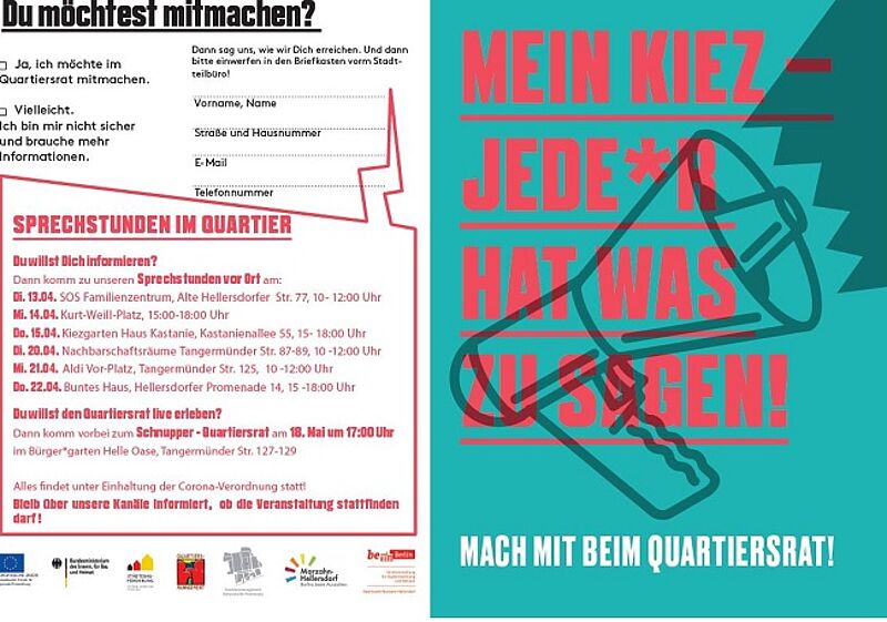 Im Quartier rund um die Hellersdorfer Promenade wird vom 14. bis zum 26. Juni 2021 der neue Quartiersrat gewählt. Bewerbungsschluss ist der 25. Mai 2021.