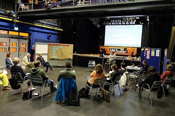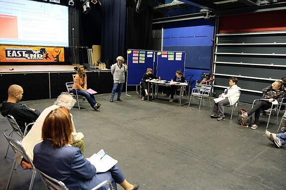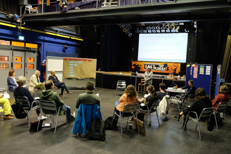 Auf dieser Börse wird mit Wissen gehandelt: Die Anwesenden auf der Projektbörse vom QM Hellersdorfer Promenade lauschten gespannt den Berichten vom QM-Team und den Projektträgern. Die Verantwortlichen berichteten im großen Saal der Jugendfreizeiteinrichtung Eastend über den aktuellen Stand der Vorhaben aus dem Programm Sozialer Zusammenhalt, über bisherige Erfolge und geplante Maßnahmen.