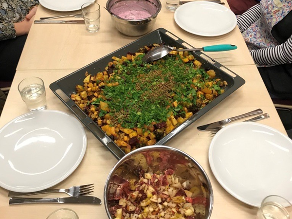Nach dem gemeinsamen Schnippeln, Kochen und Essen klang der Abend bei lockerem Austausch über gesunde Ernährung, das Kiezgeschehen und die Welt aus. Dazu gab es weitere Tipps für kreative Resteverwendung und Rezeptideen für zuhause.