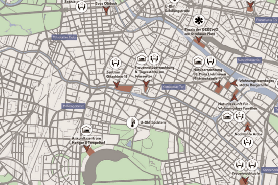 Deshalb wurde eine sogenannte „Shelter-Map“ für Wohnungslose und Hilfsbedürftige entworfen, auf der berlinweite Hilfseinrichtungen eingezeichnet sind.