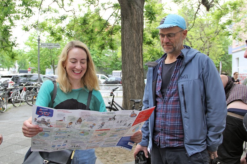 Das Team stellte zudem eine neue Fahrradkarte für den Kiez vor. Sie zeigt Standorte von Fahrradpumpen, Fahrradgeschäften, die Jugendverkehrsschule sowie Leihstationen für Lastenräder, Trinkbrunnen und Standorte von Parklets.