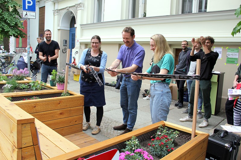 Bei dem Projekt „Kool im Kiez“ stand ein Parklet in der Adolfstraße im Mittelpunkt der Projektpräsentation. Gemeinsam bepflanzten Nachbarinnen und Nachbarn das neue Stadtmöbelstück. Zur offiziellen Eröffnung durchschnitt Almut Neumann, Bezirksstadträtin für Ordnung, Umwelt, Natur, Straßen und Grünflächen in Berlin Mitte, gemeinsam mit Quartiersmanagerin Gesine Schulze und mit einem Parklet-Paten das symbolische Absperrband. „Ich freue mich, heute ein weiteres Parklet eröffnen zu dürfen. Es sind nur wenige Quadratmeter, aber die symbolisieren, wie wir den öffentlichen Raum so viel mehr und besser nutzen können“, sagte Bezirksstadträtin Almut Neumann.