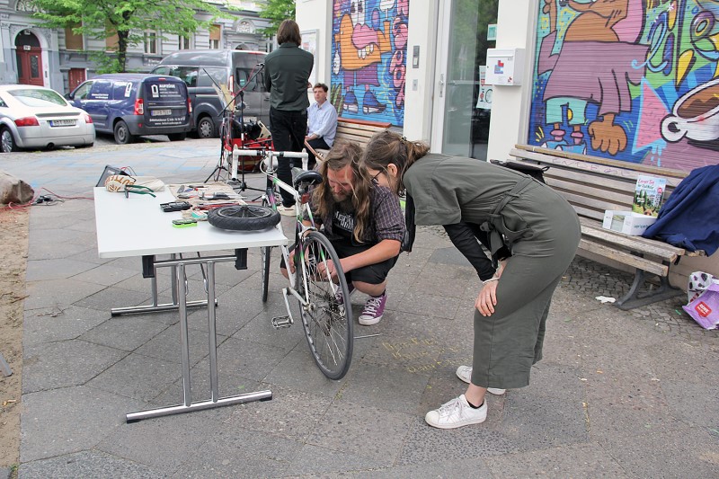 Beim Verkehrssicherheitsprojekt „SUPA! - Sicher unterwegs im Pankekiez“ drehte sich auch an diesem Tag alles ums Fahrrad. Vor dem QM-Büro in der Prinz-Eugen-Straße hatte das Projektteam eine mobile Fahrradreparaturwerkstatt aufgebaut. Alle, die wollten, konnte ihr Rad kostenfrei reparieren lassen. Dieses Angebot kam gut an, zeitweise bildete sich sogar eine kleine Schlange am Werkstatttisch.