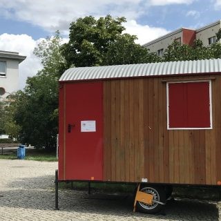 Aus dem ehemaligen Bauwagen ist ein beliebter Nachbarschaftstreffpunkt geworden. Alle Anwohnenden sind dazu eingeladen, vor dem Wagen zu Verweilen und sich untereinander auszutauschen. Der Innenraum des Wagens muss wegen der Corona-Pandemie vorerst noch geschlossen bleiben.
