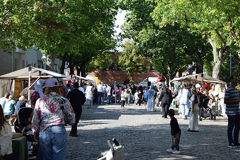 Straßenfest mit Ständen und vielen Menschen unter Bäumen, die gemeinsam Musik, Essen und Spiele genießen.