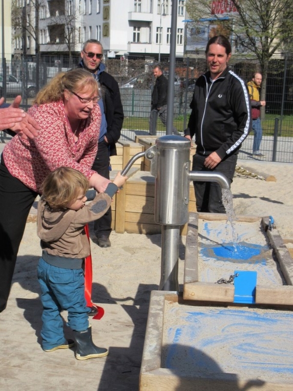 Das kann auch sein kleiner Sohn bestätigen, der gemeinsam mit Jugendstadträtin Mirjam Blumenthal feierlich die rote Schleife von der Pumpe abzog. Mit vereinten Kräften beförderten sie die ersten Liter Wasser auf den Matschtisch.