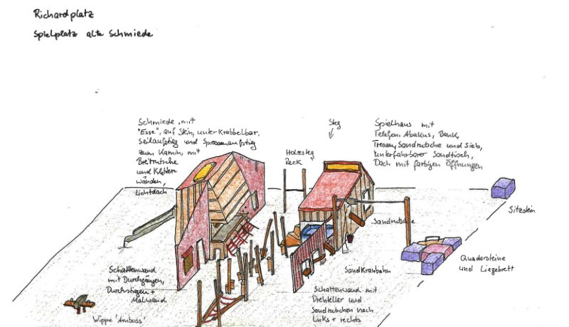 Die Sanierung der beiden Spielplätze auf dem Richardplatz im QM-Gebiet wurde bereits im Jahr 2023 beschlossen. Daraufhin hatte das QM eine Beteiligungsaktion mit den Anwohnenden durchgeführt. Zwei Jahre später ist es nun endlich so weit, zumindest für den kleineren der beiden Spielplätze. Finanziert wird der Umbau des Spielplatzes aus dem Baufonds des Programms „Sozialer Zusammenhalt“.